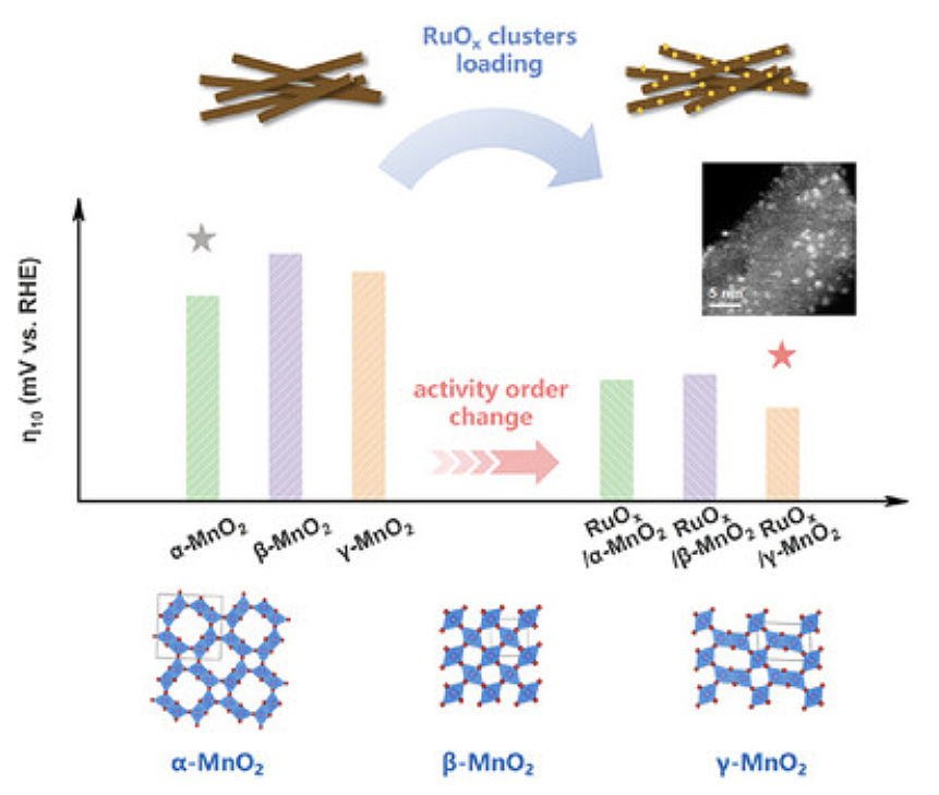 3.Development of a crystal phase engineering strategy illustrating how the MnO2 polymorph controls RuOx cluster structure, electron transfer, and Mn–O covalency, providing a pathway to design high-performance heterostructured electrocatalysts.