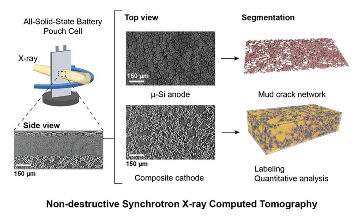 Non-destructive synchrotron X-ray computed tomography (sXCT) imaging of an ASSB pouch cell showing μ-Si anode, composite cathode, and 3D mud-crack network visualization.