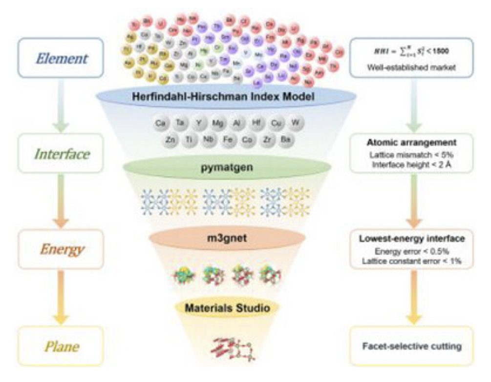 Multi-step rational screening-guided process for high-melting-point metal oxide protective layers, including the software used at each step, the screening objectives, and the screening criteria.